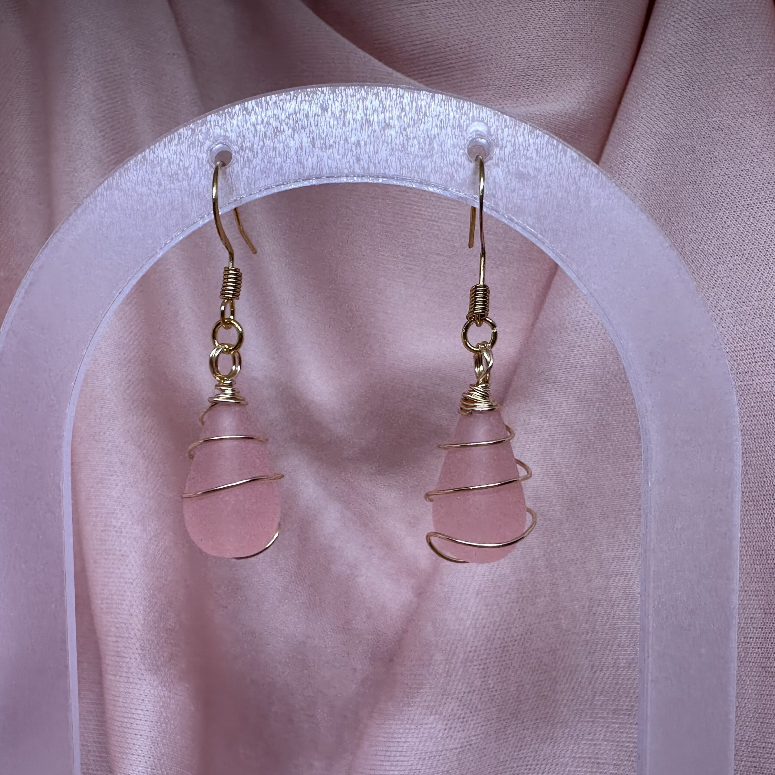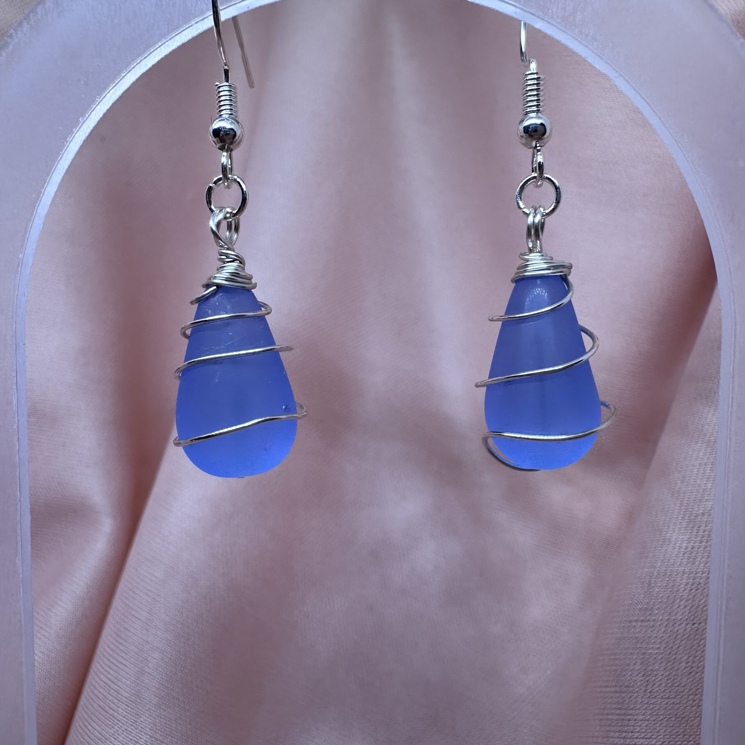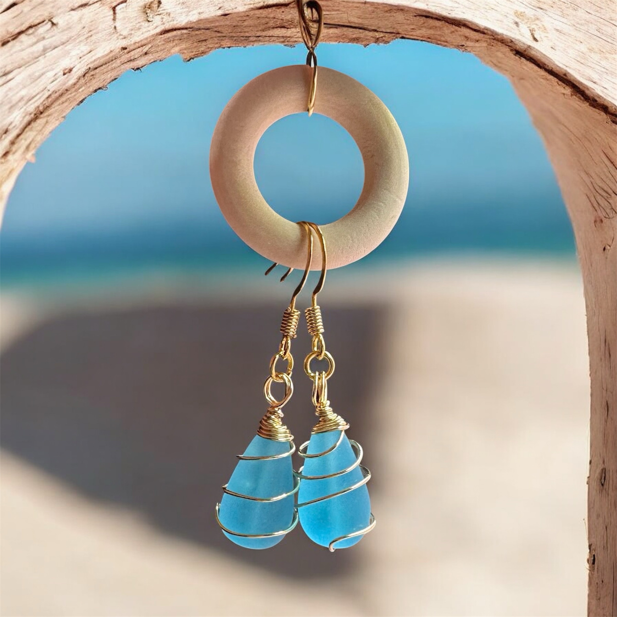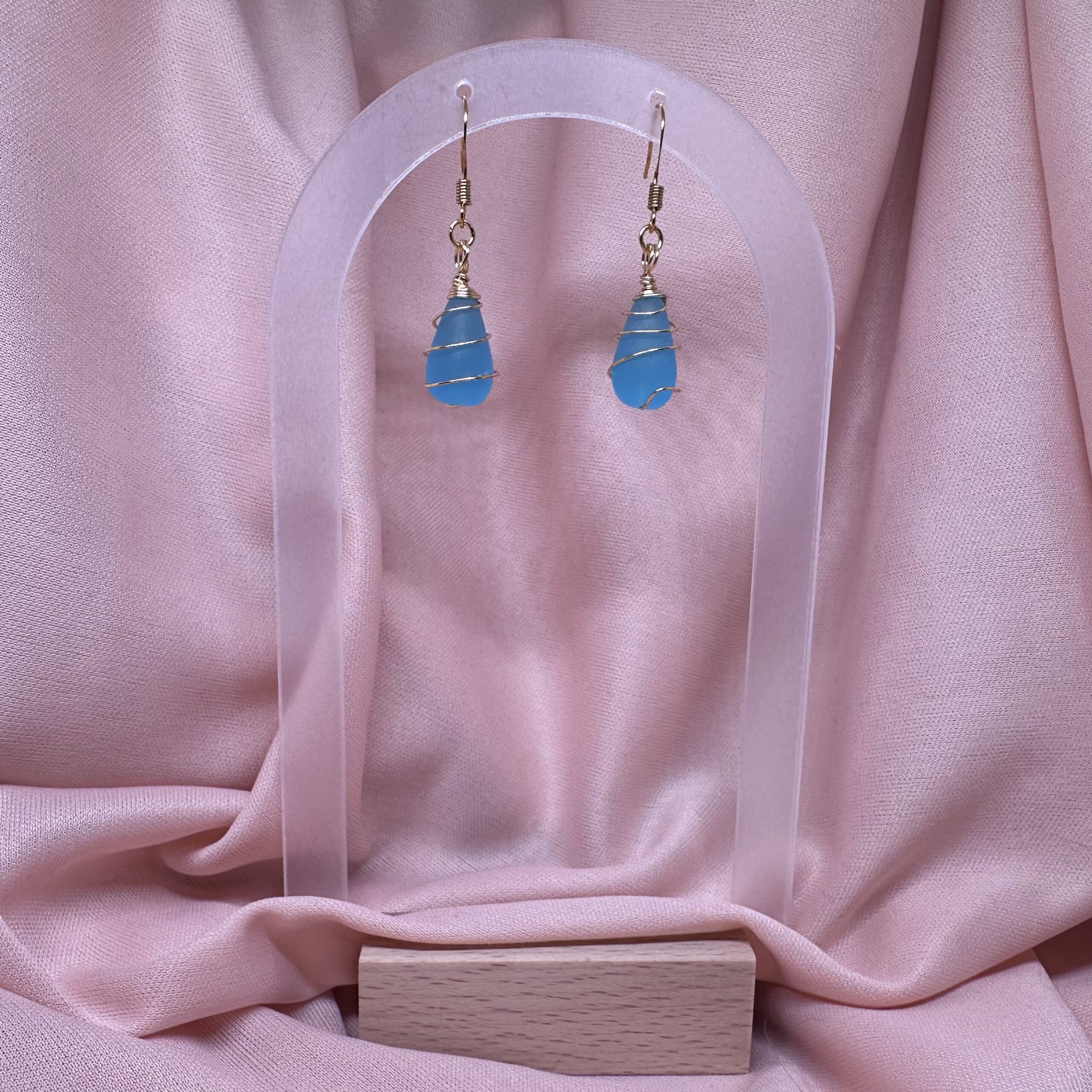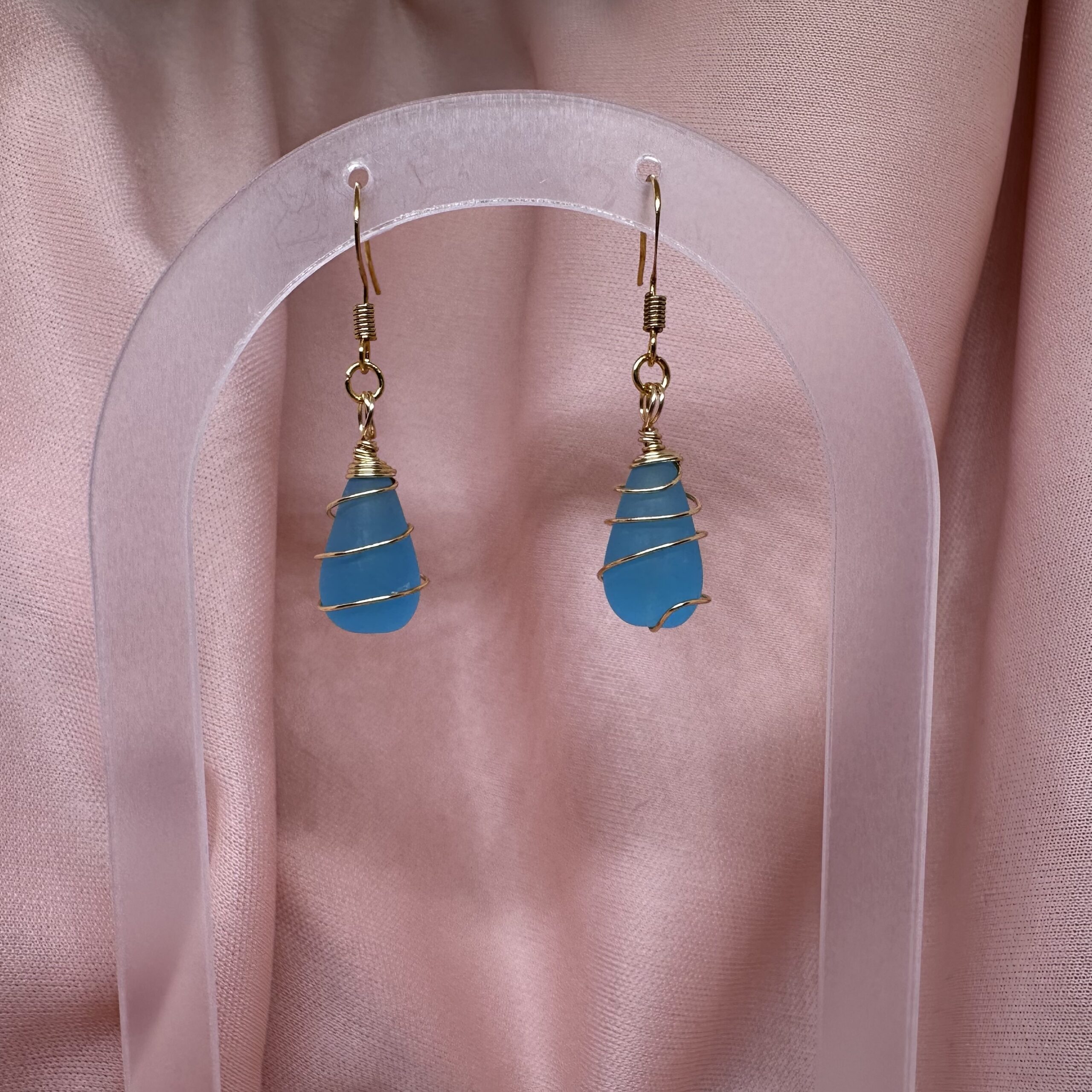 Cultured glass drop bead earrings available in three colors: ocean blue, sky blue, and misty pink. Gold plated and silver findings and ear wire.