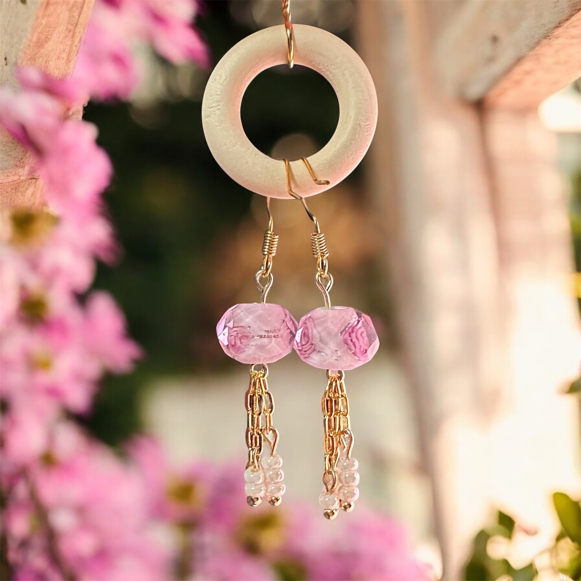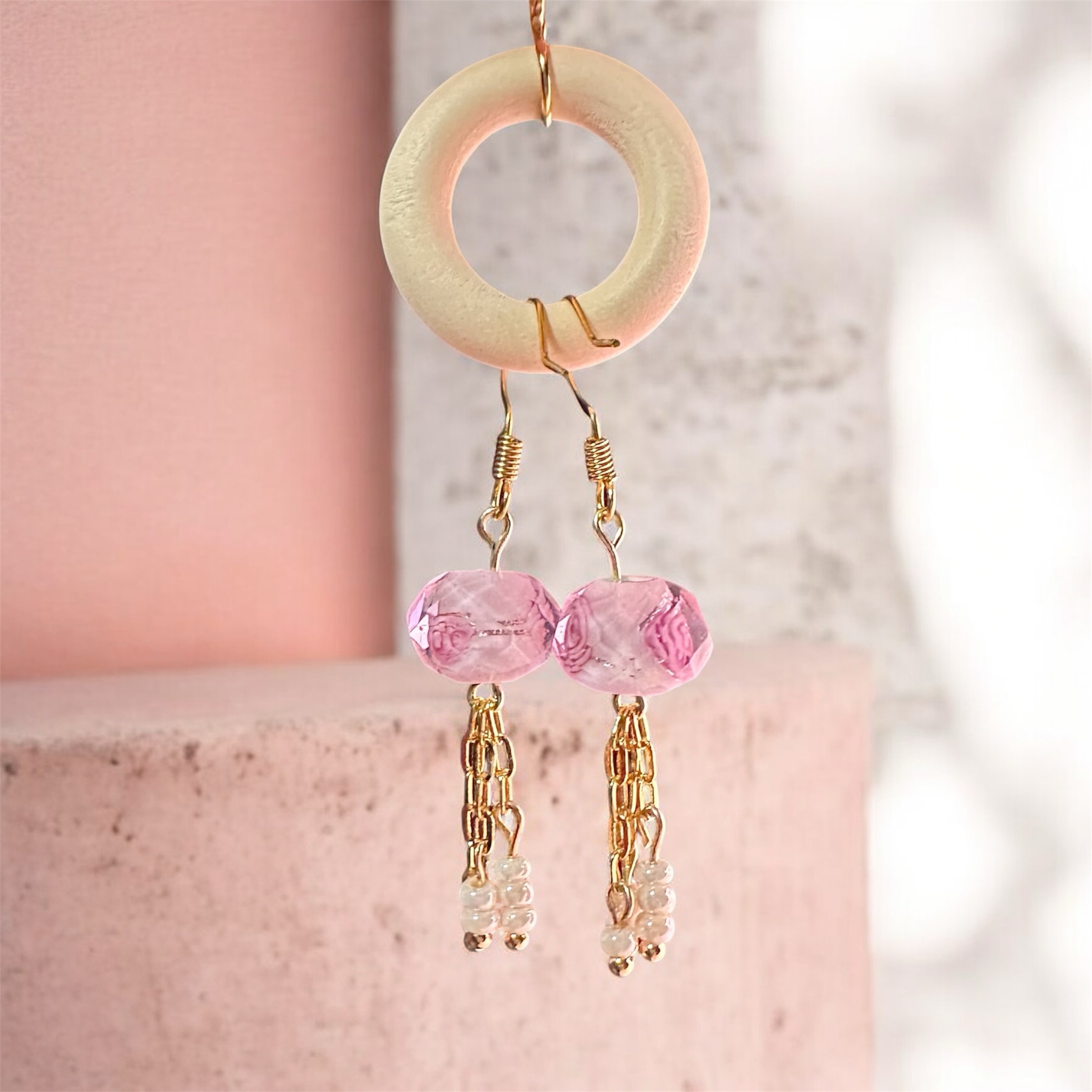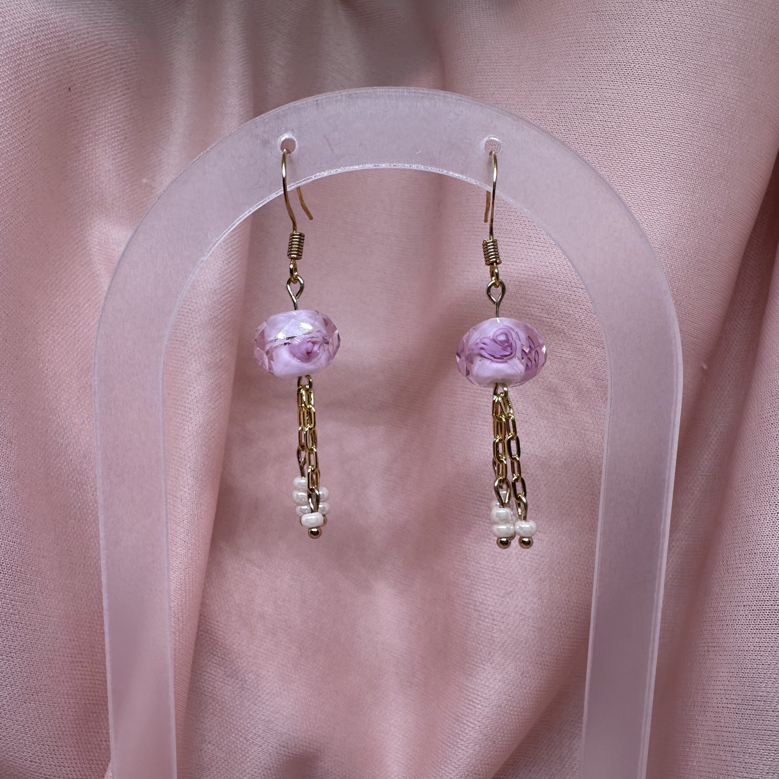 Rose glass beads with 18k gold plated chain and tiny white glass beads.
